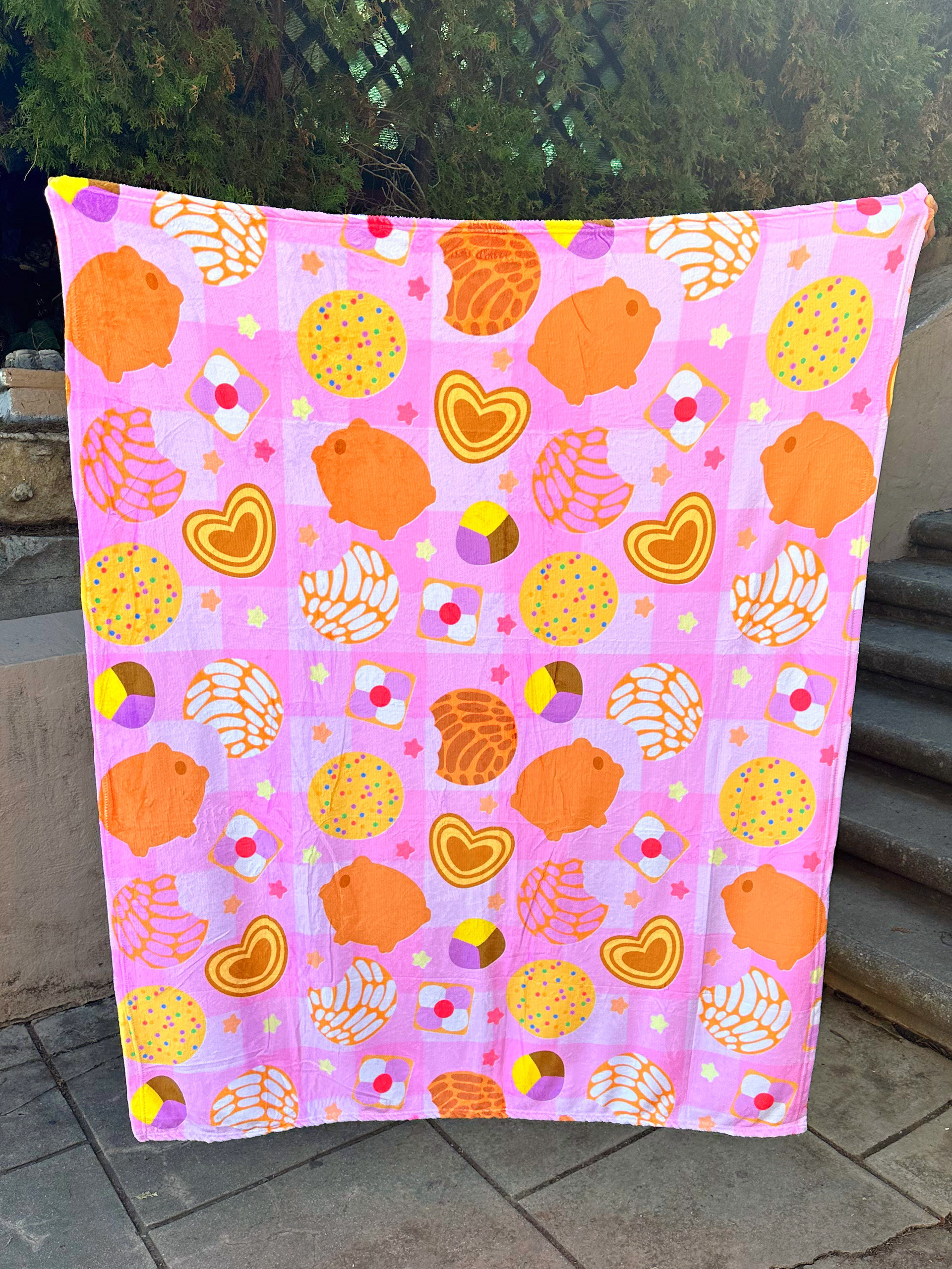 Here is one of my favorite products I have created! This is my Pan Dulce blanket which features so many amazing pan dulces (Mexican sweet breads) together on a pink background with stars. This blanket honestly looks good enough to eat, but its probably best used to snuggle up. I mean, who doesn't love bread? I created this blanket filled with pan-dulce not only because its adorable, but because it holds a special place in my culture and life. Pan dulces arent just delicious breads (they are very delicious though) but they are also a symbol of togetherness, tradition, and comfort for a lot of us. I wanted to use my artwork to celebrate that significance and bring a sense of happiness and familiarity to anyone who shares a connection to this.